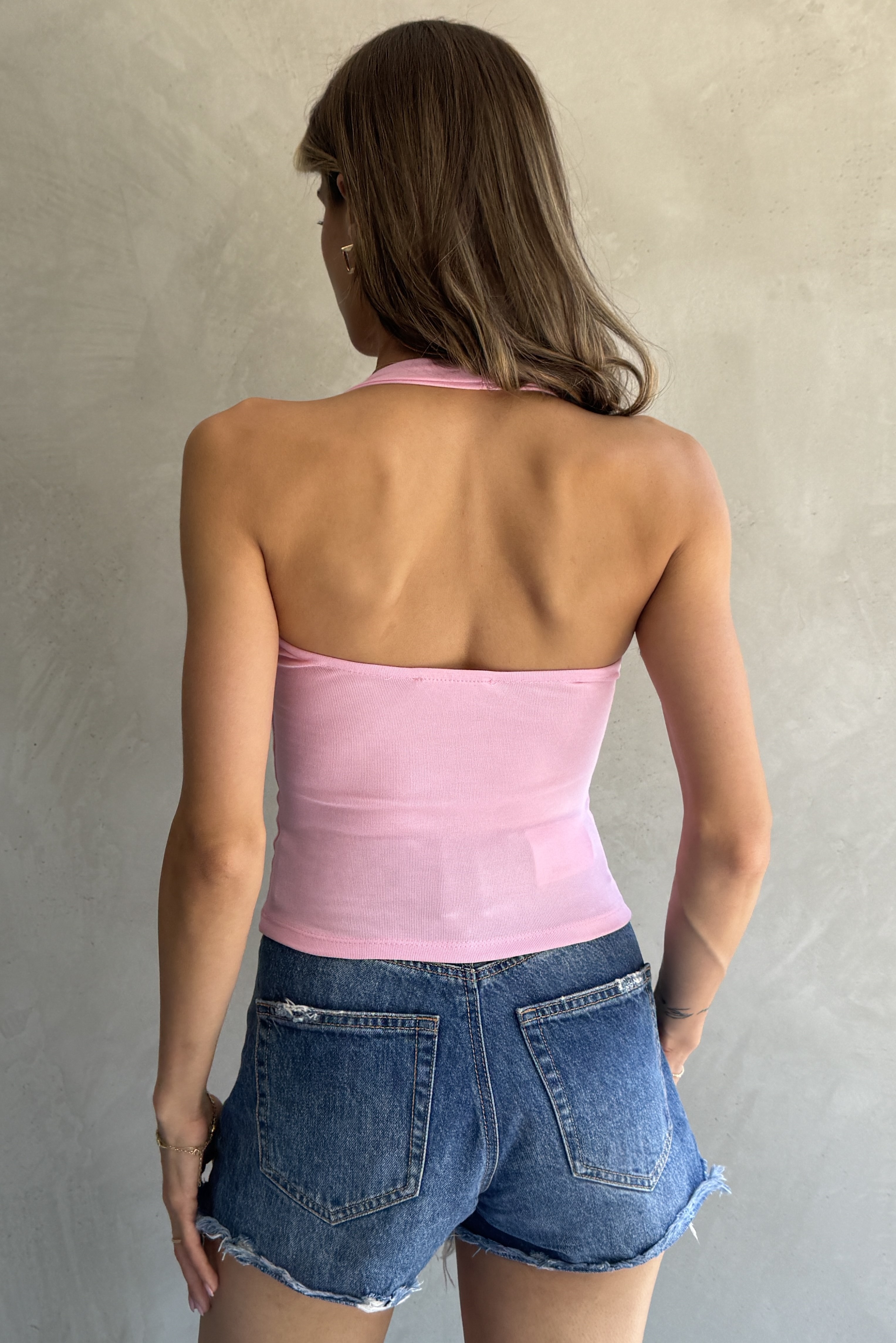 Boyundan Askılı Pembe Crop Örme Bluz (10163-17)